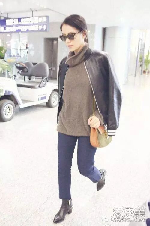 高圆圆用棒球衫款式的皮夹克配大地色的高领毛衣,帅气不失温柔,九分裤配尖头短靴也是优雅知性。