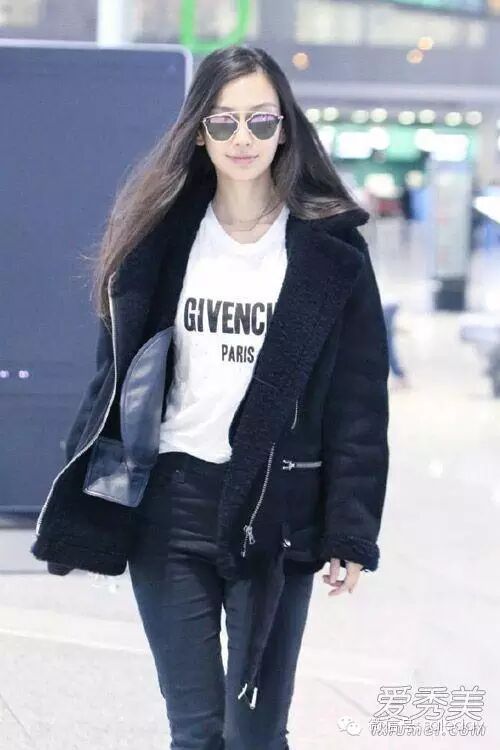 Angelababy现身机场穿得有点多哦,黑色羊羔毛外套配白T恤和黑色紧身裤,简单帅气欧美范儿。