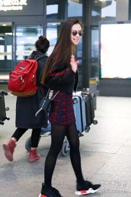 baby的另一套街拍look,穿黑色短款夹克外套配格子短裙和黑丝、运动鞋,帅气活泼的运动少女形象,青春无敌。