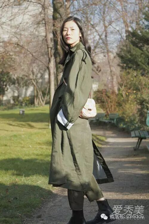 表姐刘雯用绿色风衣配绿色九分裤,潇洒帅气的look尽显超模气场,配粉色包包增添柔美