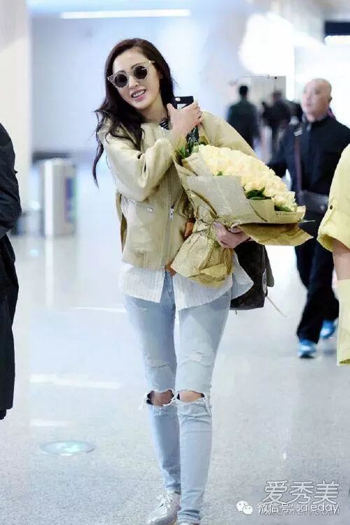 张天爱衣品也很赞,用米色外套配白衬衫和破洞牛仔裤,简约大方的造型不失时尚气息。