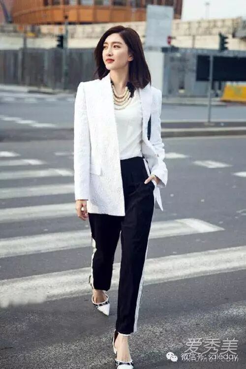 江疏影用白色小西装配白T恤和黑色九分裤,九分裤侧面加入条纹元素,这可是今年的大热门,时尚博主们早就争先恐后地穿上了。佩戴珍珠饰品增添优雅与高贵。