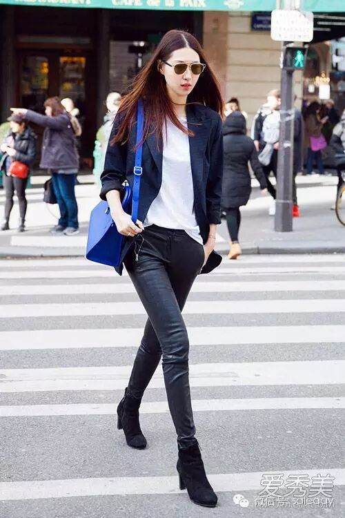 剪裁精炼的黑色小西装搭配白T恤和黑色紧身裤,黑色靴子,宝蓝色包包让简单造型变得靓丽吸睛。