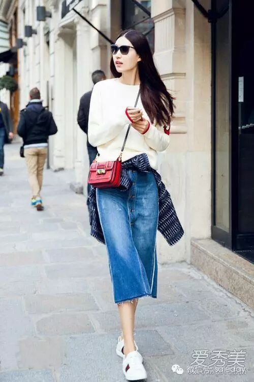 it girl李晖用白毛衣配牛仔半身裙和小白鞋,青春乖巧,减龄十岁,仿佛回到了学生时代。
