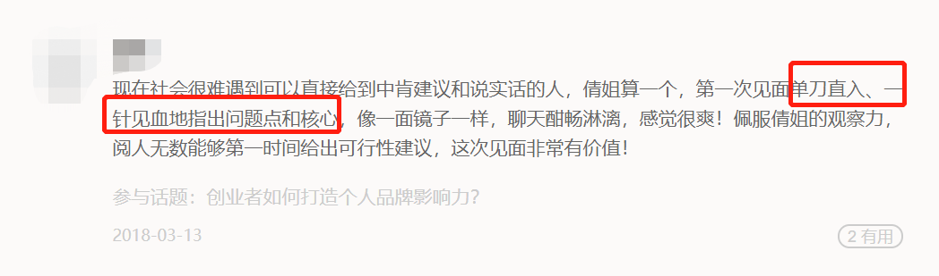 作为在行的营销类行家,倩姐也神奇的保持了该领域的“三高”状态:约见人数高、约见价格高(3000元 / 次)、好评率高(平均9.8分)。