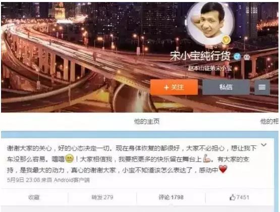 节目播出后,网友纷纷对其病情表示关心。对于网友的关心,宋小宝发文致谢:“谢谢大家的关心,好的心态决定一切……大家相信我,我要把更多的快乐留在舞台上。”
