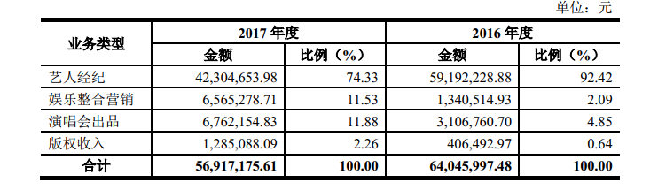 说明书显示,从业务构成来看,巨匠文化的营业收入由艺人经纪、娱乐整合营销、演唱会出品和版权收入四部分组成。其中,主要营收源于艺人经纪业务。