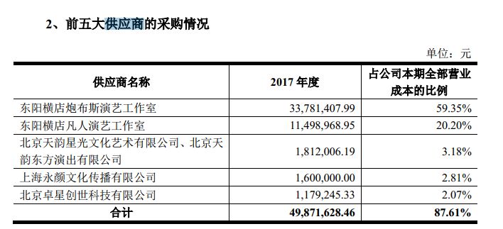 除此之外,从供应商方面来看,巨匠文化2016、2017 年度前两大供应商——东阳横店炮布斯演艺工作室及东阳横店凡人演艺工作室两家公司,分别系公司实际控制人、董事长胡海泉,以及公司监事会主席陈涛(陈羽凡)的工作室。