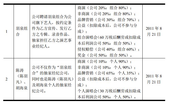 说明书在“艺人经纪合同”中列明,公司于2011年8月21日聘请羽泉组合为旗下艺人,独家担任其演艺事业经纪人;与此同时,巨匠文化也是陈涛(陈羽凡)及胡海泉个人的独家经纪公司。