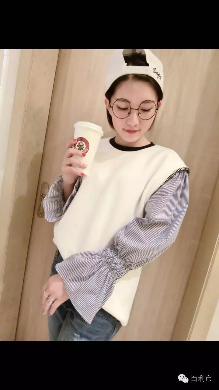 拼接款T恤,袖子部分拼接不同面料,更加个性,袖子是今年大热的荷叶边,显得你的手臂纤细修长。