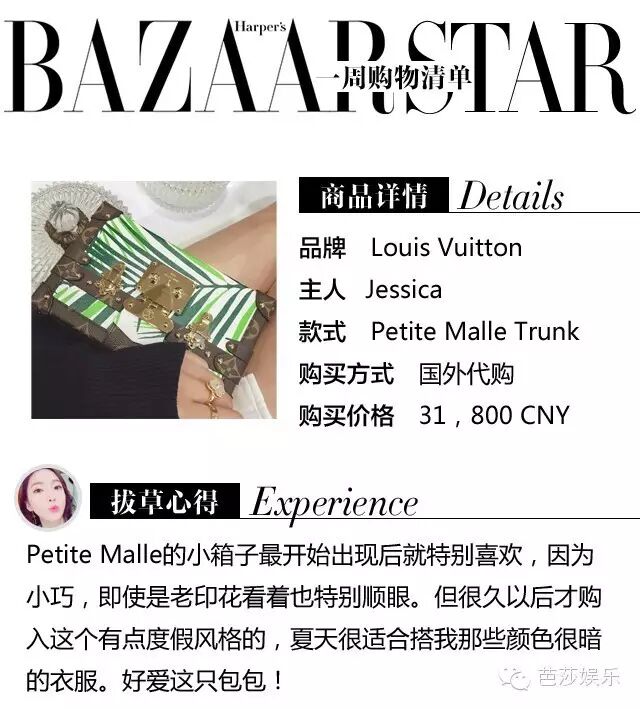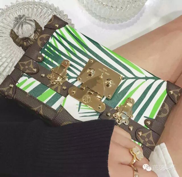 Jessica的盒子包包也算是Louis Vuitton的经典款,但她选则老花配绿色条纹的款式不仅不老气还充满热情洋溢的热带气息