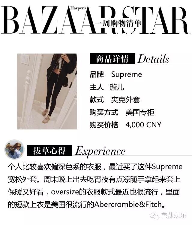 璇儿的Supreme夹克外套更是经典中的经典,只要简单搭配一身同色系单品就能很好看