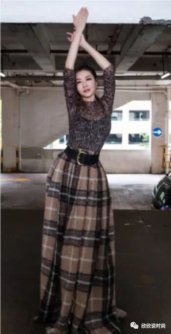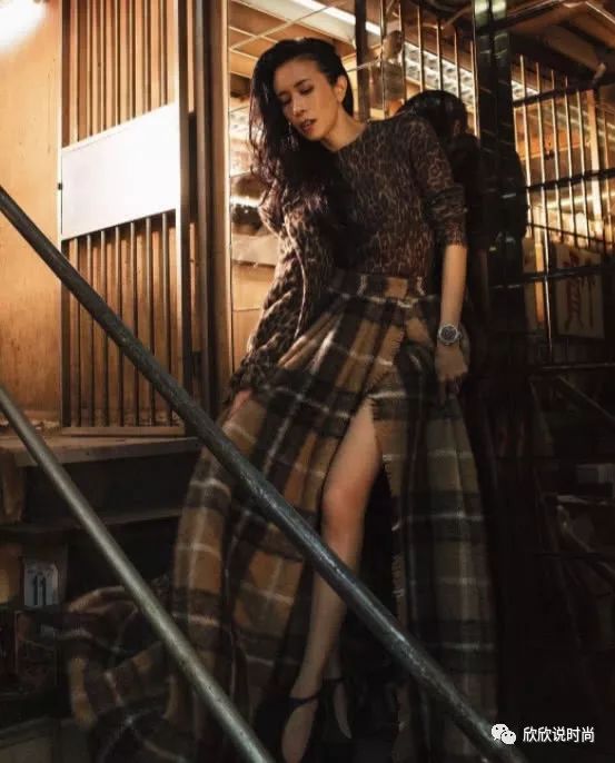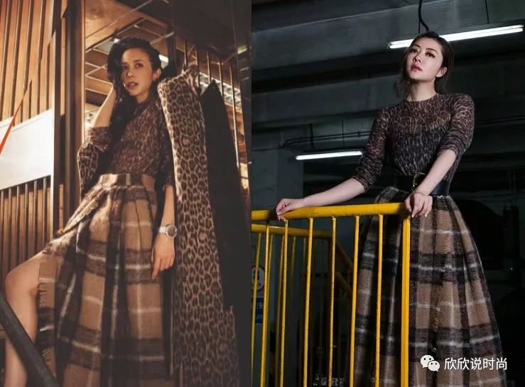 而这次与莫文蔚撞衫的正是这一身豹纹透视上衣的搭配造型,只见熊黛林身穿一件深色的豹纹透视上衣搭配格纹半身长裙,裙子腰间的黑色腰带做点缀,突显了完美的身材比例,瞬间打造出两米八的强大气场,对着镜头拗出性感撩人的姿势,看起来妩媚动人有带有几分时尚高级感,非常的nice。