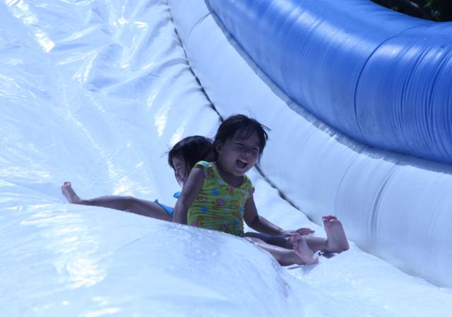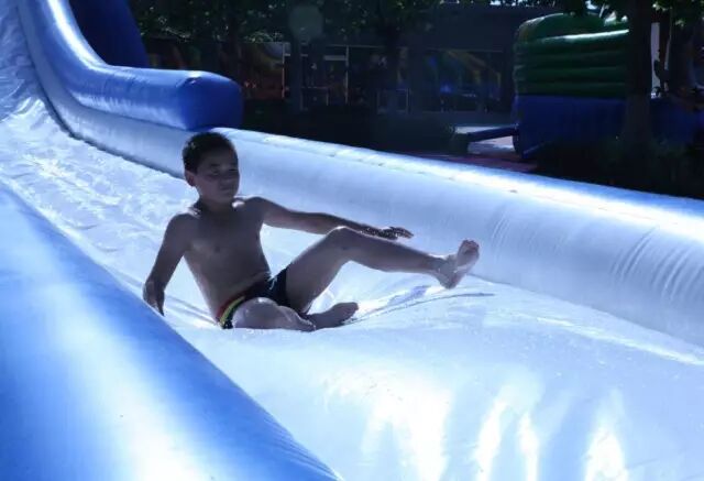 走到滑梯最上面“唰”地一下直往下冲,水花四溅,是不是超级刺激呢?