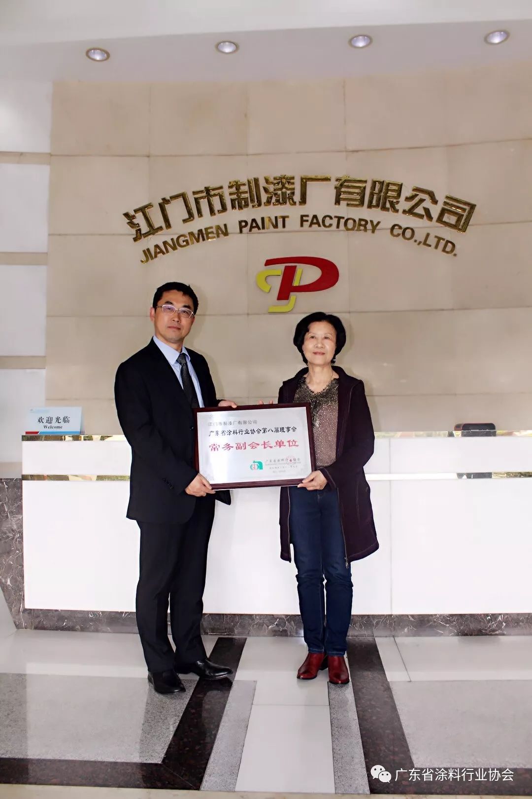 随后,陈冰会长一行针对化工园区布局、企业人才储备、产品结构调整方面给予江门制漆发展的建议。今年1月,经广东省涂料行业协会常务副会长会议提议,江门制漆、巴德富、广州擎天增选为常务副会长单位,并经过第八届理事会第一次工作会议理事投票全票通过。今天,陈冰会长亲自为江门制漆授予“广东省涂料行业协会常务副会长”单位牌匾。