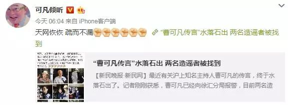最近有关沪上知名主持人曹可凡的传言,终于水落石出了。记者9日获悉,曹可凡已经向徐汇分局报警,目前两名造谣者已经被警方找到,此事仍在进一步调查之中。