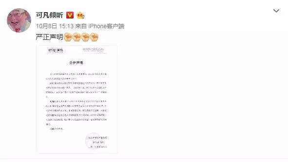 △10月8日,曹可凡个人官方微博“可凡倾听”发布一则公开声明