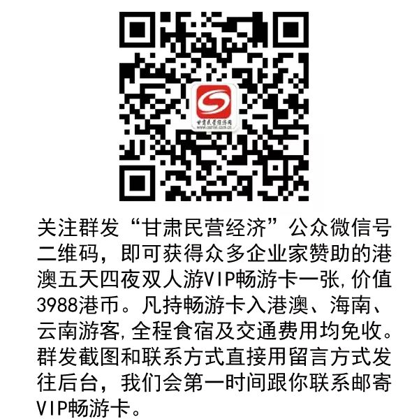关注群发“甘肃民营经济”公众微信号二维码,即可获得众多企业家赞助的港澳五天四夜双人游VIP畅游卡一张,价值3988港币.凡持畅游卡入港澳、海南、云南游客,全程食宿及交通费用均免收。群发截图和联系方式直接用留言方式发往后台,我们会第一时间跟你联系邮寄VIP畅游卡。