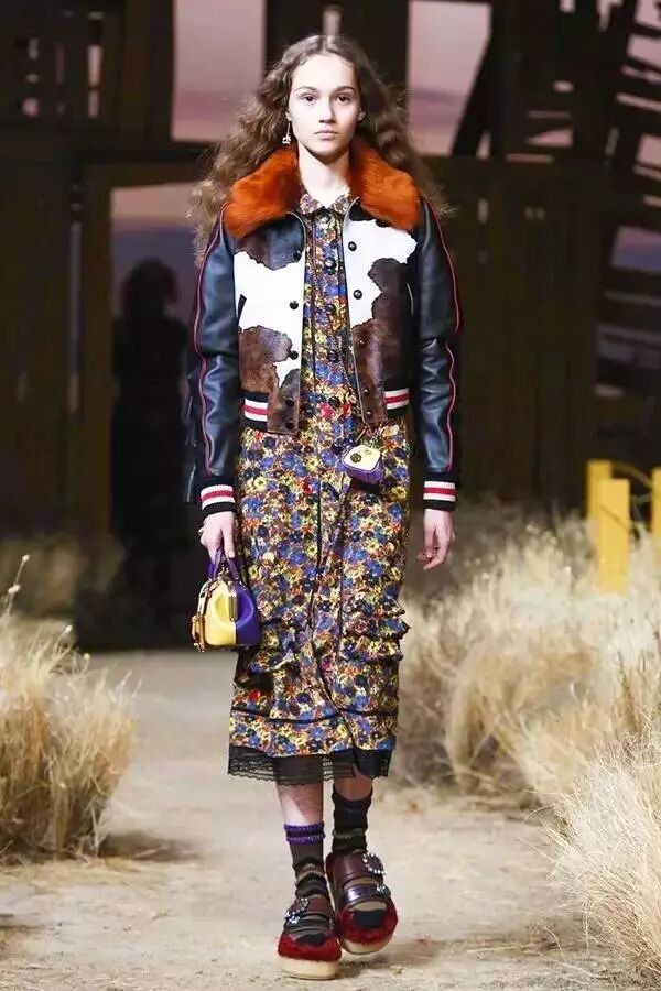同样是皮衣E姐更喜欢wuli大幂幂这身皮衣加少女短裙的装扮,幂幂身着MIUMIU17早春新款黄色杠条机车真皮皮衣外套,上身帅得不要不要的,袖子上的黄色条纹是一大亮点,短款的机车夹克版型,很显身材比例。