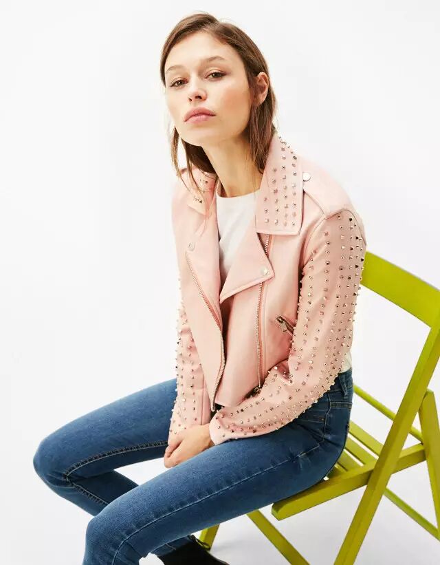 推荐理由:铆钉是今年流行的元素,甜美的粉色搭配硬朗的铆钉皮衣,有种柔中带刚之美。
