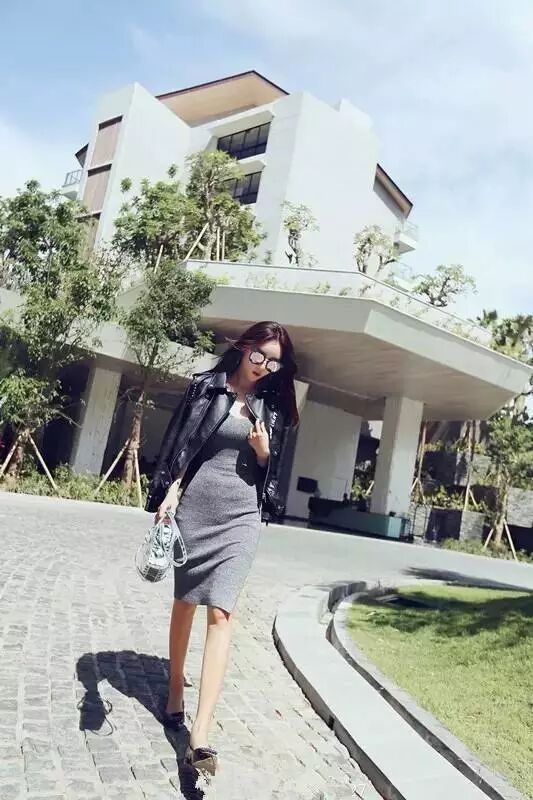 A字裙就能让人一下子安静端庄起来,皮衣也收敛锋芒,与A字裙一起变得优雅起来,不过最好选择这种短款皮衣,露出腰线,线条更优美。