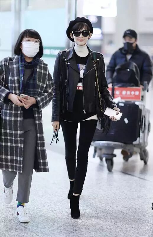 2017年1月4日,古力娜扎也穿了小皮衣,她将圣罗兰家的T恤套在针织衫外面,搭配古驰的小皮衣,气场十足。