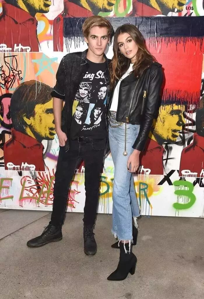 2017秋冬纽约时装周秀场嘉宾:凯亚·葛伯 (Kaia Gerber) 和汤米·希尔费格 (Tommy Hilfiger)现身Tommy Hilfiger秀场,Kaia Gerber自带好身材和大长腿,皮衣加喇叭裤帅气十足!