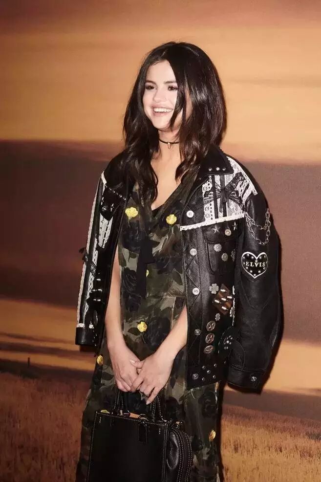 赛琳娜·戈麦斯 (Selena Gomez) 2017年2月14日,穿机车夹克+花朵连衣裙现身2017秋冬纽约时装周蔻驰 (COACH) 秀场。