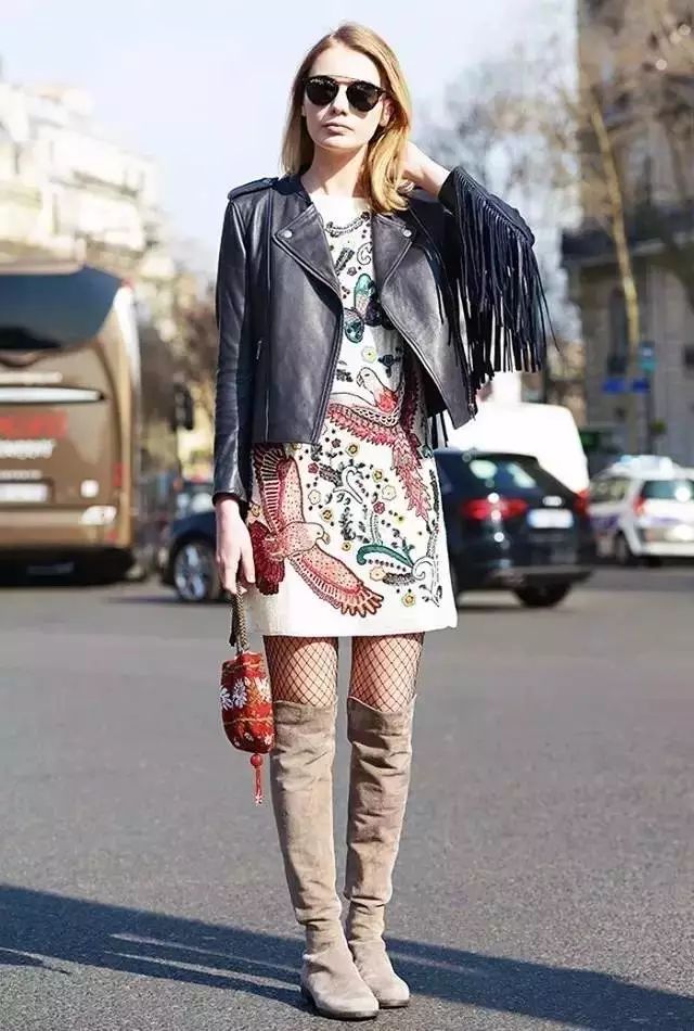 内搭连衣裙,懒人的大爱,两件单品穿起来直接出门,简单粗暴又时髦,对于鞋也没那么多讲究了,皮靴、运动鞋、高跟鞋都不会出错。