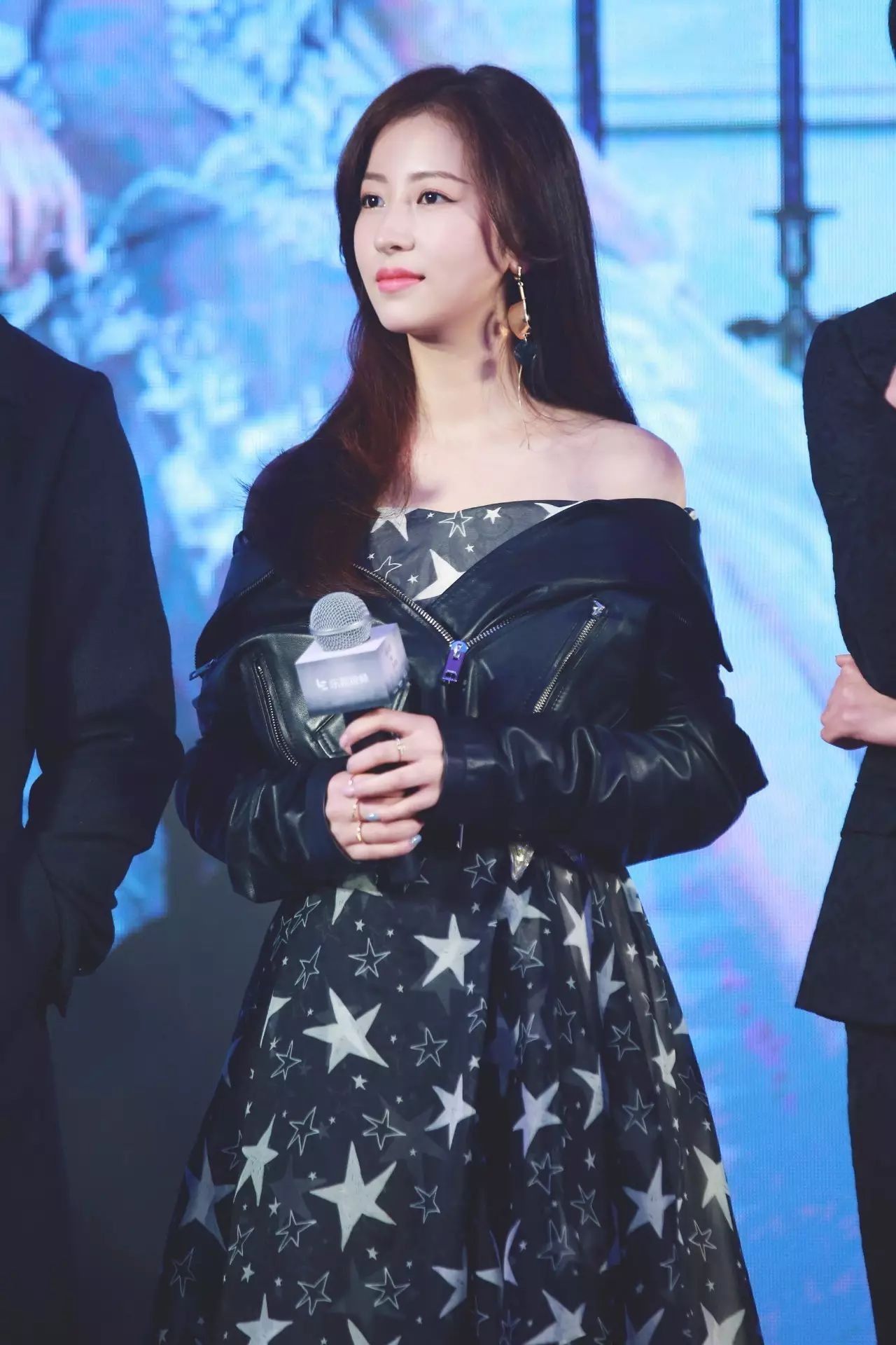 周雨彤出席电视剧《我和你的光年距离》发布会,一袭星星印花连衣裙搭配短款小皮衣,甜美中又带着酷酷的感觉。