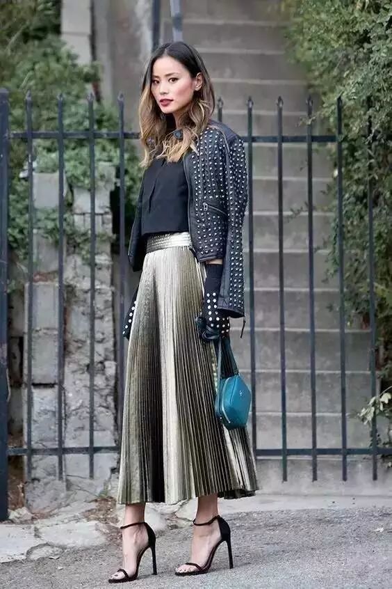 皮衣搭配阔腿裤反而在洒脱干练的同时还保持优雅,今年的流行金属色也是不错的选择,绝对是人群中的焦点。