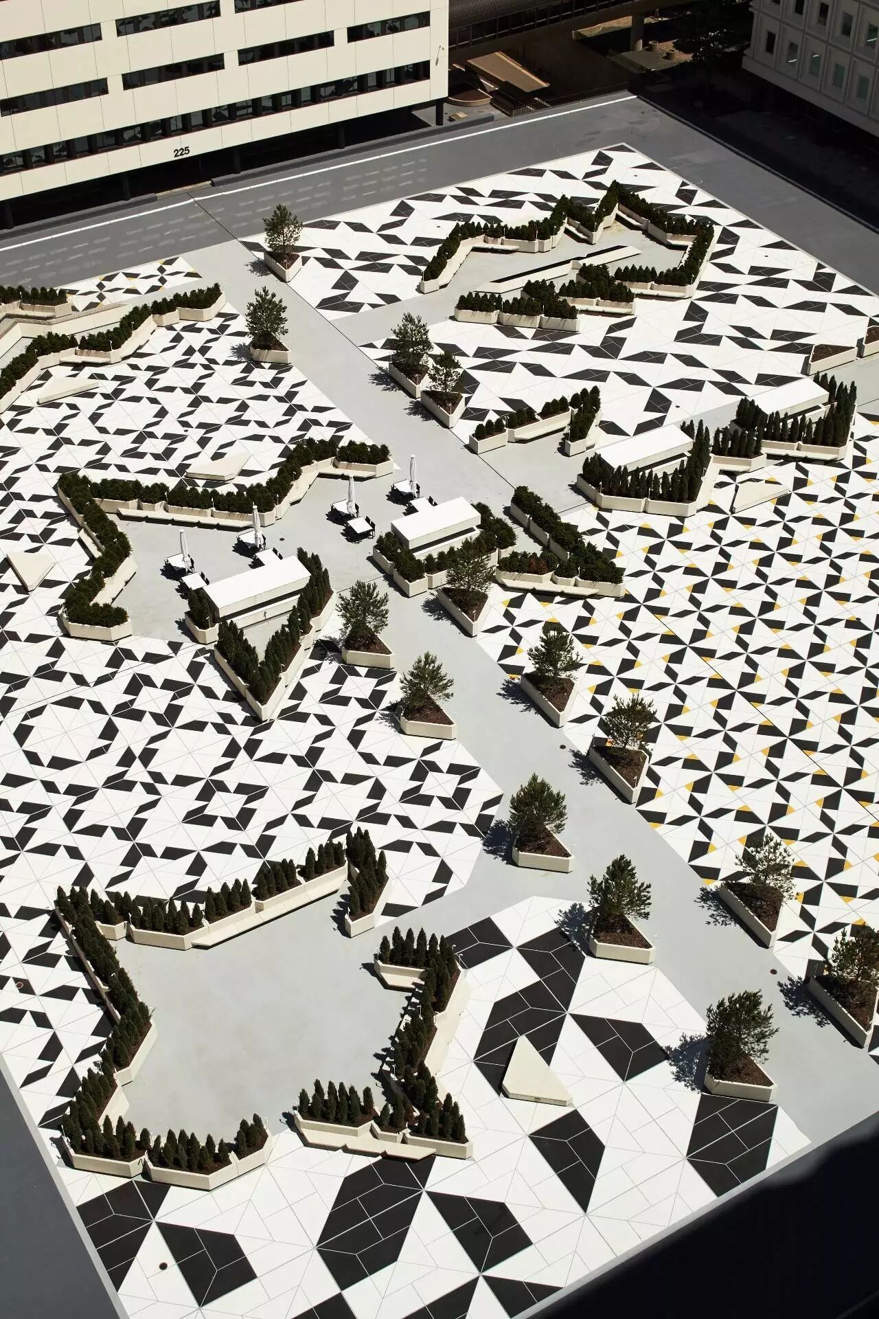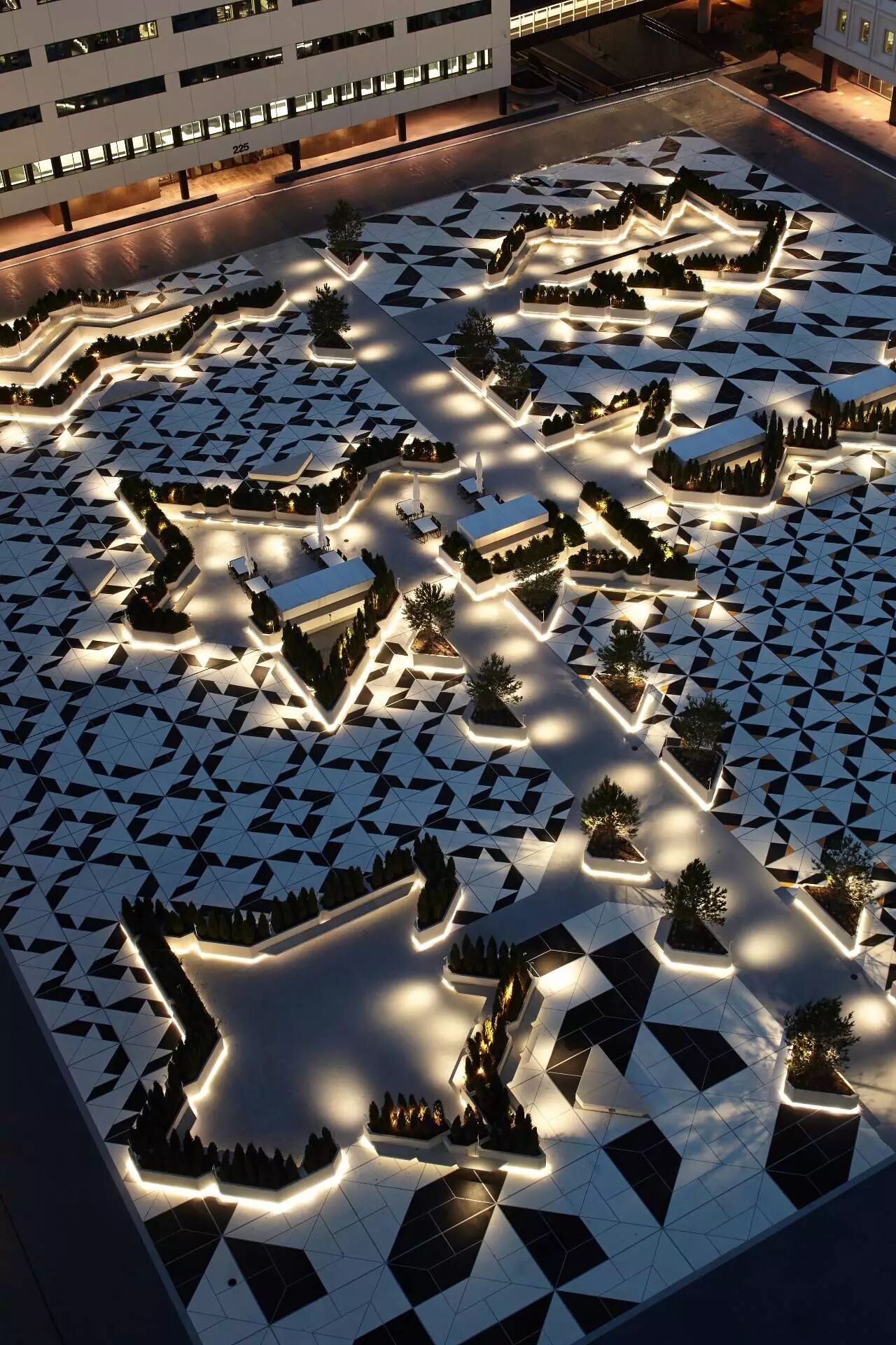 在3M公司总部大楼改造项目中,基地原本的中央停车场转变为一个铺满七巧板瓷砖的大型步行广场。而这一设计风格也同样应用在了广场景观中的混凝土植物种植槽、座位,以及凉棚。其表面使用了3M stamark胶带(这是一种通常被用于道路标志的高反射粘合剂背衬材料)。