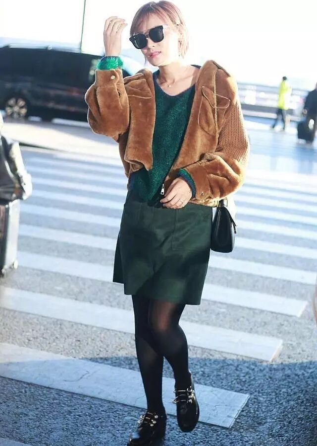 绿色的衣服真的特别的土气,这个颜色非常的显老,穿起来更加有一种老妇女的感觉了,黑色的丝袜搭配起来很奇怪的。因为腿型也不是那么的好看的啊。就特别的土了。