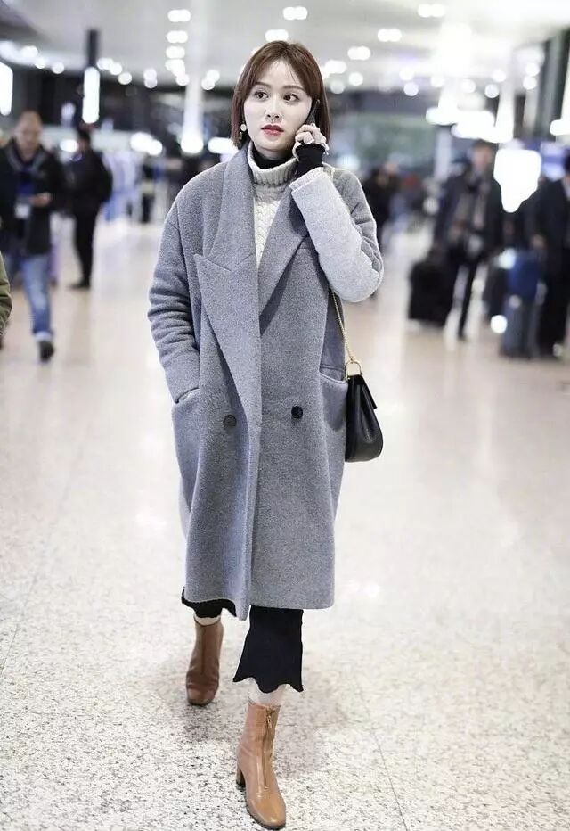 这样的灰色的大衣里面搭配了白色的高领的毛衣,选择了一条黑色的阔腿裤来搭配衣服。这个就不是那么的土了。还是很时髦的啊,而且穿的靴子很搭她的衣服了。