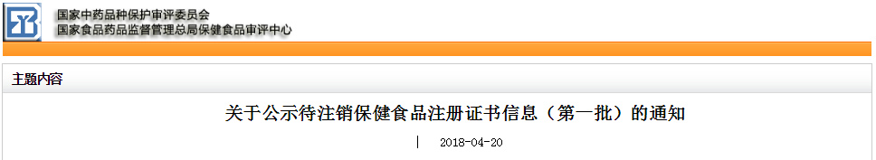 根据《保健食品注册与备案管理办法》《关于保健食品延续注册申请有关事项的公告》(总局2018年第22号)的相关规定,我中心梳理了待注销保健食品注册证书信息清单(第一批)(见附件)。现对该信息进行公示,公示期自即日始15个自然日,即2018年4月 20日至5月4日。凡对公示信息有异议者,请及时以来函形式向保健食品审评中心反映。