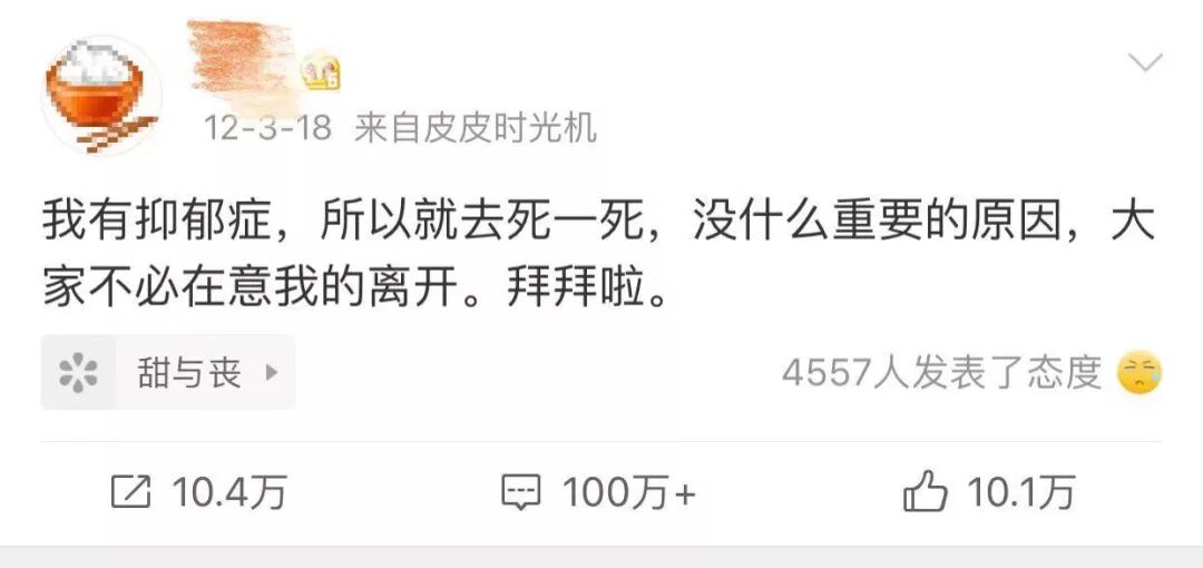 “我有抑郁症,所以就去死一死,没什么重要的原因,大家不必在意我的离开。拜拜啦。”