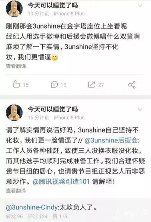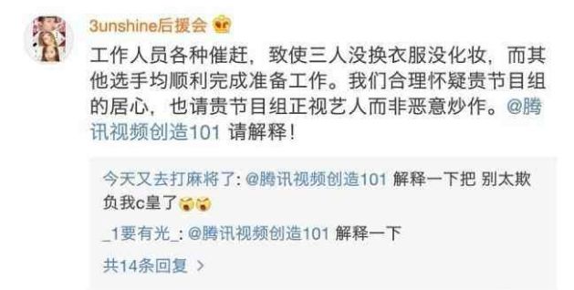 粉丝后援会也在评论中直指,因为工作人员的催赶,导致三人没能完成服装造型,请节目组不要恶意炒作。