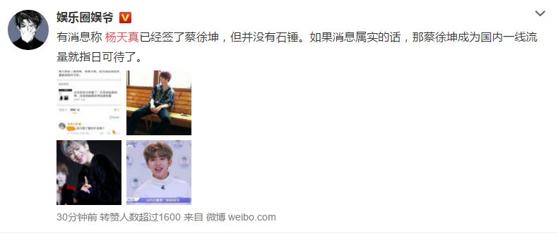 网上更是传闻,鹿晗前经纪人杨天真已经签了蔡徐坤,蔡徐坤成为国内一线流量指日可待!