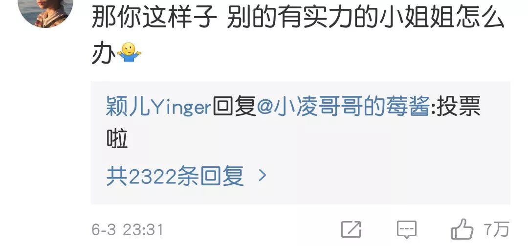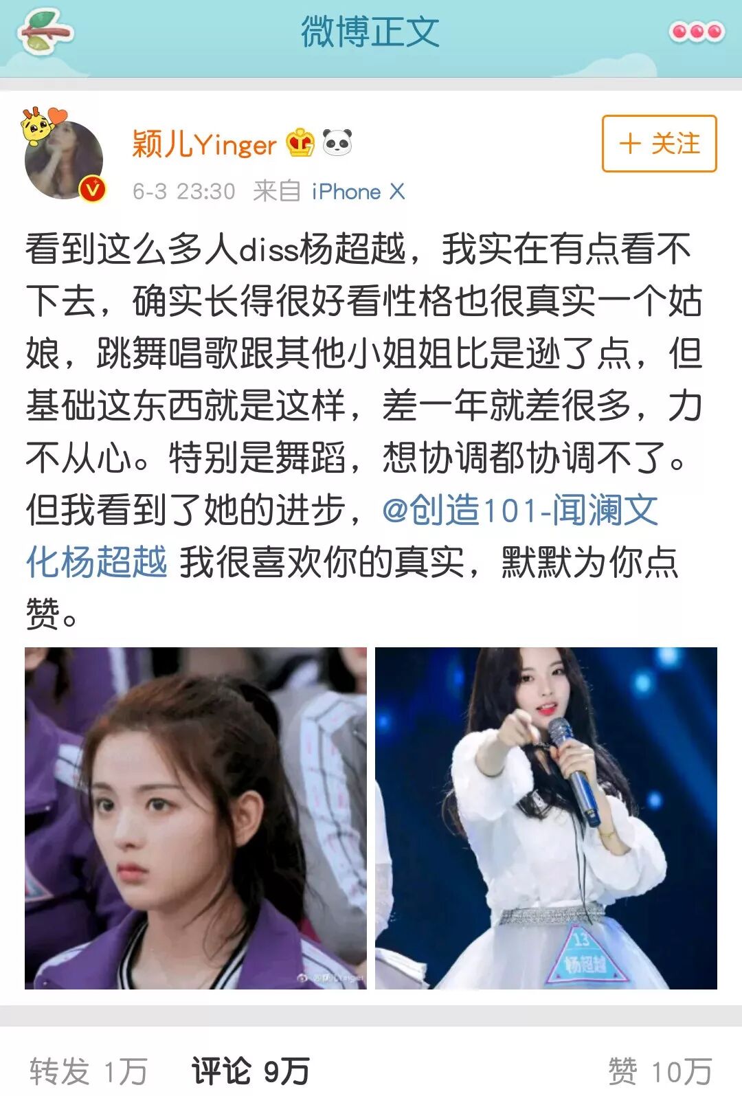 6月3日,颖儿在自己的微博上说道:“实在看不下去那么多人diss杨超越,基础是差了点,但我看到了她的进步。我很喜欢你的真实。”