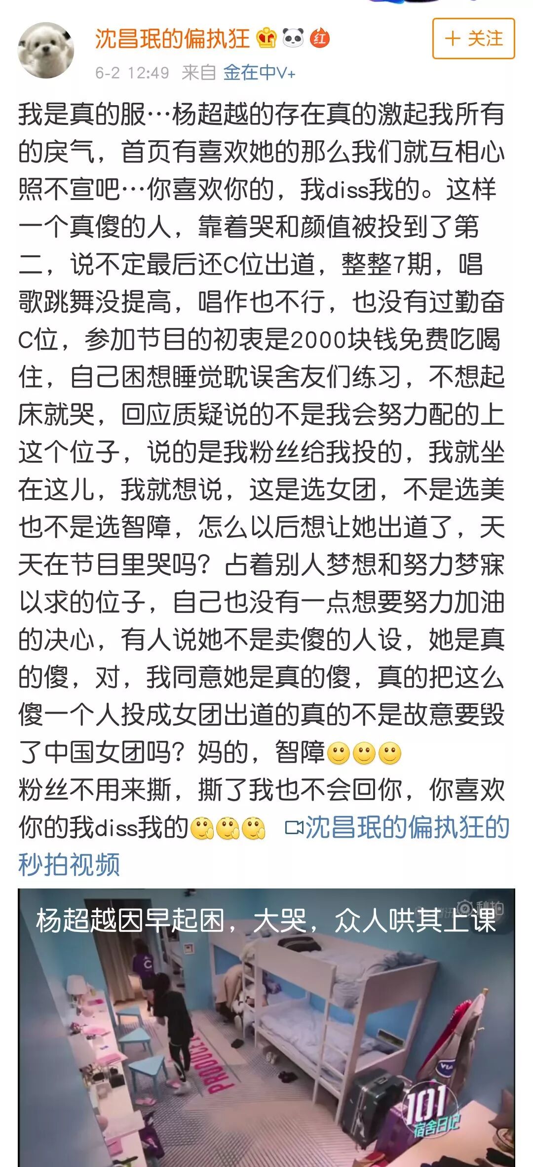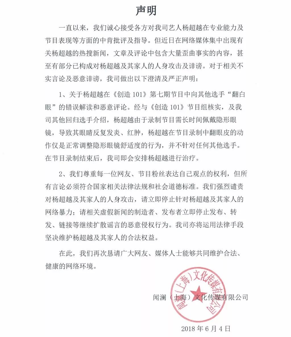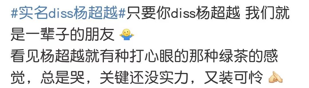 为嘲而嘲,为黑而黑的网络暴力真的太可怕了。如果你不喜欢杨超越,你可以不给她点赞,你可以说她业务能力不好,你可以讨厌她爱哭,你可以说她不是你心目中的女团人选。但动不动就要打人,说别人是白莲花,是傻子,捕风捉影,真的合适吗?