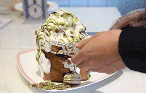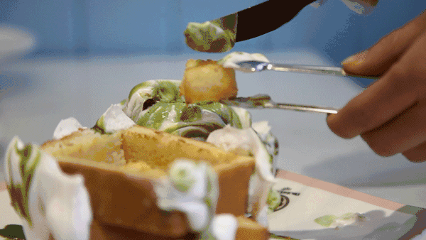 Dazzling现烤特制吐司佐上自制抹茶冰淇淋、进口鲜奶油、抹茶马卡龙、抹茶脆皮和精致的裱花,还没吃我已经执意认为它一定是可口的。