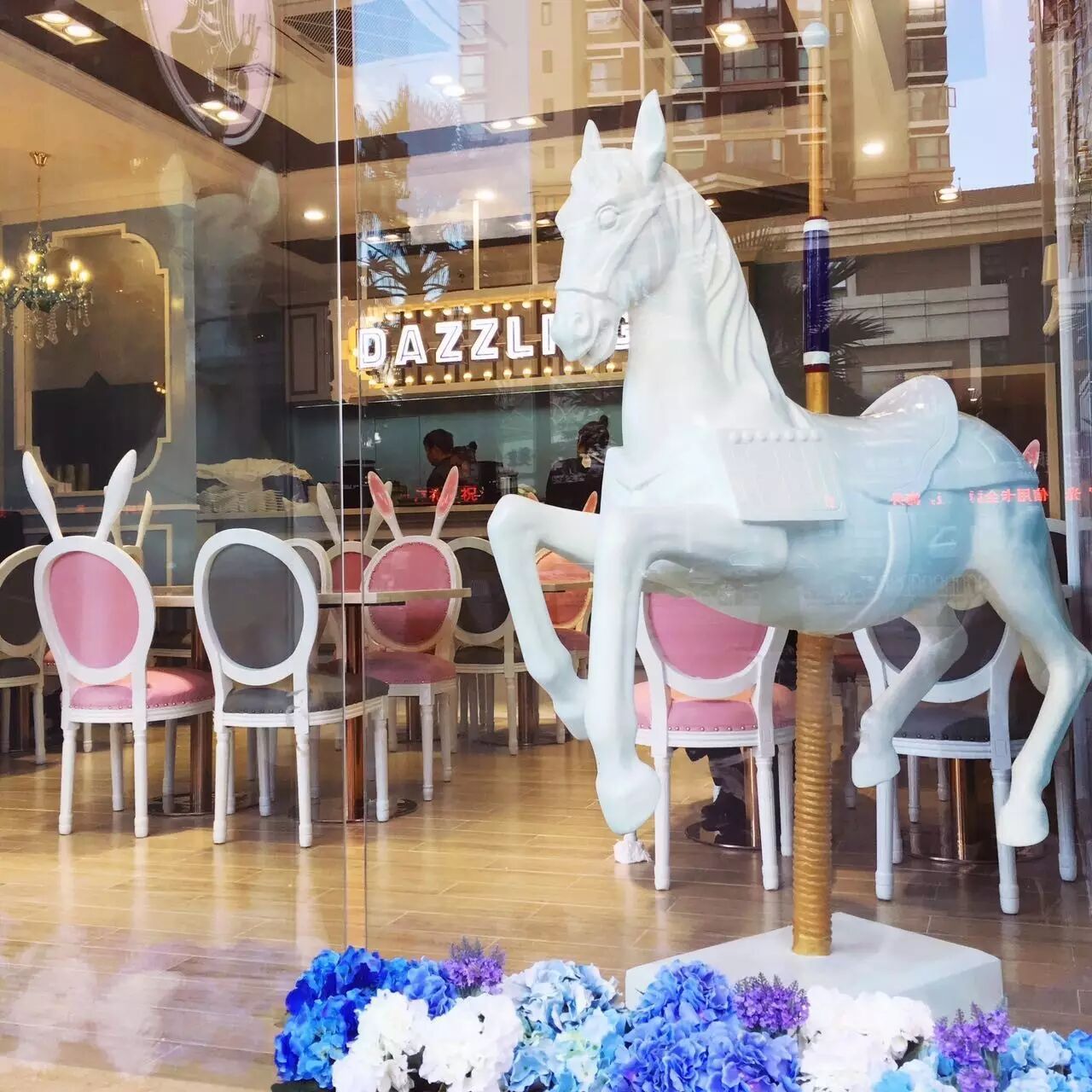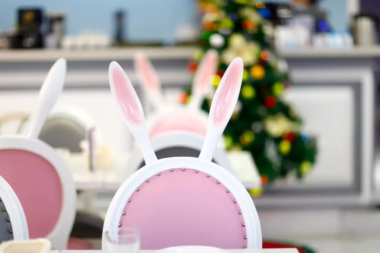 店里可爱的长兔耳椅子和白马装饰是Dazzling的特点,一粉一灰的座椅搭配,似乎是为粉兔公主和白马王子特设的约会专座。