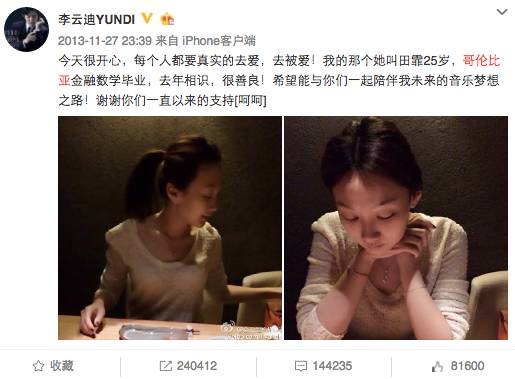 就在同一天的晚间,李云迪也通过微博公布恋情晒女友照片,并称:“今天很开心,每个人都要真实的去爱,去被爱!我的那个她叫田霏25岁,哥伦比亚金融数学毕业,去年相识,很善良!希望能与你们一起陪伴我未来的音乐梦想之路!”