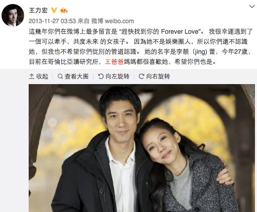 王力宏于2013年11月27日凌晨发微博承认已有女友,还附上了一张与女友的亲密合照。据了解,王力宏的女友是哥伦比亚大学硕士。