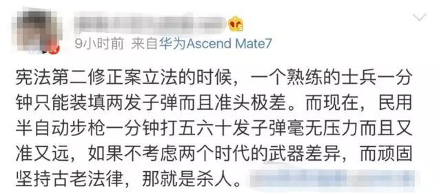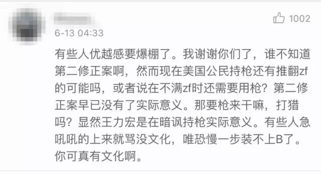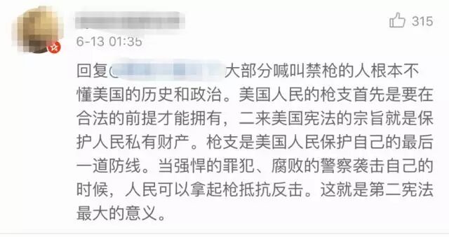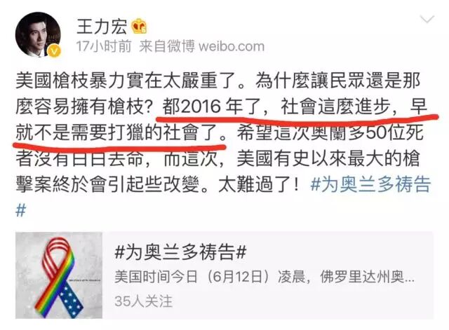 王力宏对美国枪击案的评论,引起部分中国人不满 环球时报 港台男星 2016-06-13 19:52:25 391 创作不易,用心坚持,欢迎请BaGua喝几杯爱心咖啡!打赏并支持本文 打赏并删除本文 今天,全世界都被美国奥兰多市发生的恶性枪击事件所震惊。至少50条无辜生命的逝去,以及50多条生命生死未卜的惨烈程度,更令此案成为了自911恐怖袭击事件以来,美国本土发生的最严重的一次袭击事件。 于是,就连平时不怎么介入社会事件的知名的美国华裔歌手王力宏,今天凌晨也几乎是在第一时间对这一惨案发表了评论,认为此案也体现了美国严重的枪支暴力问题,并认为50名死者的丧命,应该促使政府做出一些改变。 谁知,他的观点却引起了一些中国网民的不满...比如,在王力宏上面这条微博的热门评论中,就有一些获得上百条点赞的中国网民的留言,似乎是想给王力宏这位从小生长在美国,接受美国教育长大的美国人普及一下美国的历史和政治。 例如其中一条评论就写到:大部分喊叫禁枪的人根本不懂美国的历史和政治。美国人民的枪支首先是要在合法的前提才能拥有,二来美国宪法的宗旨就是保护人民私有财产。枪支是美国人民保护自己的最后一道防线。当强悍的罪犯、腐败的警察袭击自己的时候,人民可以拿起枪抵抗反击。这就是第二宪法最大的意义。瞧瞧这口气和从中所流露出的优越感,似乎这位网友真是铁了心的认为,只有像美国那样拥有持枪的自由才是正义与进步的——不论实际上这导致每年多少人会死于枪支暴力。 而反对持枪就是无知和落后的表现? 讽刺的是,这位急于“教育”王力宏和支持王力宏的网友的人,却似乎并没有看懂人家王力宏的原话,特别是这句——“都2016 年了,社會這麼進步,早就不是需要打獵的社會了”。是啊,都2016年了,在今天美国这个文明进步的社会,即便是保护私产,哪还需要再用枪这种极为原始野蛮的手段去解决问题呢?法律不是更可靠更公平么?所以,也难怪有支持王力宏的网友挖苦说: 有些人优越感要爆棚了。我谢谢你们了,谁不知道第二修正案啊,然而现在美国公民持枪还有推翻zf的可能吗,或者说在不满zf时还需要用枪?第二修正案早已没有了实际意义。那要枪来干嘛,打猎吗?显然王力宏是在暗讽持枪实际意义。有些人急吼吼的上来就骂没文化,唯恐慢一步装不上B了。你可真有文化啊。而这条有理有据的评论,也获得了近千条点赞。 实际上,不仅仅是王力宏,在美国还有大量完全清楚美国宪法第二修正案的美国公民,在站出来反对枪支暴力,支持加强枪支控制,乃至禁枪。比如美国知名天体物理学家Neil deGrasse Tyson就在自己的社交网络帐号上写到:▲翻译:“为啥很多美国人只知道照搬宪法第二修正案去为持枪合法辩护,而不是去深入探究持枪到底好不好呢?”——话说,他这条言论获得了大量美国网友的点赞与支持就连美国总统候选人希拉里·克林顿也在此案发生后,第一时间表达了对加强控制枪支的呼声的支持,更不用说此前已经19次表态支持控枪的美国总统奥巴马了... 而专业机构提供的关于枪支暴力的数据统计,更是直接展现了美国枪支暴力的问题,已经严重到了何种程度。 美国华盛顿邮报的一篇报道就整理了这些干货,并一一呈现给了感兴趣的公众,例如:1、在1982-2012年期间发生的大规模枪击案中,绝大多数的作案枪支都是从合法途径获得的。2、从1975年到2010年之间,越来越多的美国普通家庭选择不再持有枪支。3、虽然持有枪支的美国“良民”越来越少,可枪支暴力——特别是大规模枪击案,却在这些年里反而呈现上升趋势!上面这些数据,其实已经说明了一个无法回避的现实:那就是今天的枪支自由,方便的并不是那些守法本分的普通美国公民,而恰恰是那些有着犯罪企图的恶棍,甚至恐怖分子! 甚至,当越来越多的美国人选择相信法律而不是枪炮子弹时,不加管控的枪支自由反而令他们越发沦为了罪恶势力的待宰羔羊! ▲在奥兰多枪击案中失去亲朋的人们....所以,王力宏们呼吁美国政府加强控枪有着充分的理由,更不需某些不了解情况,只是无脑羡慕美国各种自由的中国人来“教育”他们。 而且中国网民中,也不乏比那个要“教育”王力宏和大家的人更懂得美国宪法历史的人才。但因为懂得更加深入,人家说出来的话也就更客观,更值得参考。比如有网友就指出:美国修正案第二条制定的时候,普通人手里还没有现在这种“一分钟打五六十发子弹毫无压力而且又准又远”的步枪,拿上一把把自动步枪,就可以进行一次大屠杀。那时的枪基本上是滑膛枪,一个熟练的士兵一分钟只能装填两发子弹而且准头极差...所以,用那个时候的法律,却维护今天的持枪合法化,“就是杀人”。而且说实话,在今天这个21世纪,任何受过教育的人都应该清楚,没有限制的自由,只会对社会的和谐与发展造成反作用。一个典型的例子是,当西方打着“宗教自由”的旗号搅乱中东世界的政治格局时,那自由并没有给中东带来稳定与进步,反而释放出了令全世界都恐慌的恐怖主义恶魔! 而另一个正在发生的例子则是欧洲的难民危机:不加限制的允许任何难民进入欧洲的“自由”,正在给多个欧洲国家埋下了恐怖袭击的定时炸弹。甚至不加限制的“言论自由”,更是一方面令极端思想在美国本土的中东族裔中快速传播着,一方面又令右翼势力的极端排外声音获得大量支持,