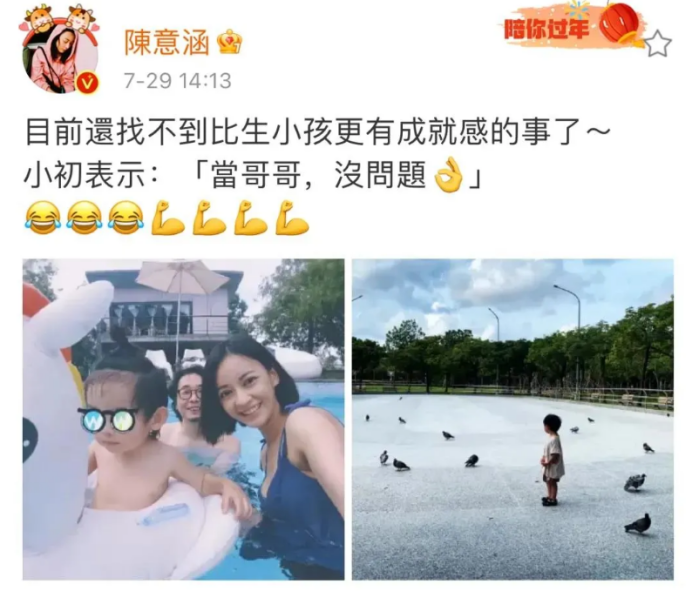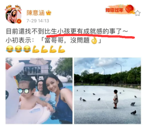 做母亲,如果各方面的条件都稳定,这种幸福感,是可以让一个女人的生命重启的。所以请注意,陈意涵写的二胎宣言——“现在找不到比当妈妈更有成就感的事。”