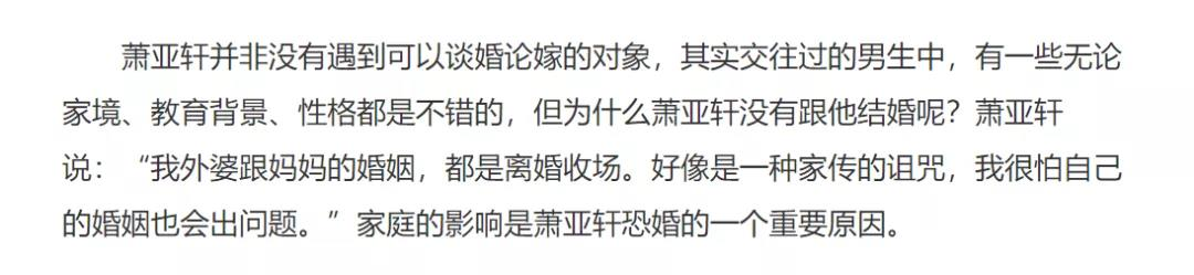 萧亚轩曾经不止一次说过惧怕婚姻,因为外婆和妈妈的婚姻都是离婚收场,好像一种家传的诅咒。