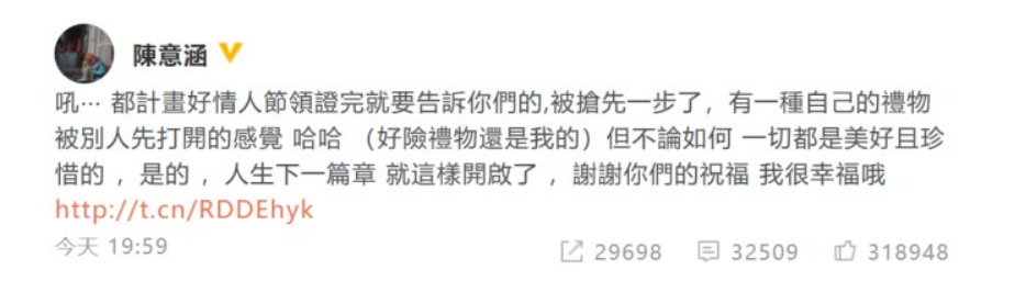 2018年8月,陈意涵忽然宣布怀孕,并在三天后登记结婚。