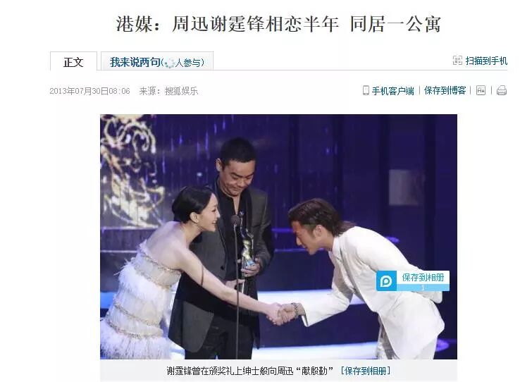 哦,还有一个陈年八卦,差不多是2013年夏天的时候,港媒还曾爆过周迅和谢霆锋相恋同居,两人都没承认。