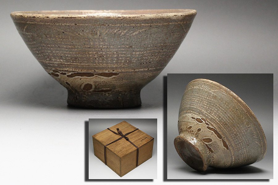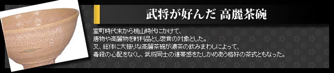 从村田珠光(1432-1502,室町时代中期的茶人)开始提倡清净淡泊的「佗茶」(わび茶)之后,除了唐物之外,一些从高丽来的高丽茶碗(高丽茶碗:在朝鲜半岛烧制的茶碗的总称)也开始引起茶人们的喜爱。当时的高丽茶碗,有不少是很粗糙的杂器,原本不能登上大雅之堂,但却正好和珠光的寂静朴拙的「佗茶」人生观相吻合,故而和唐物一起,被视为茶碗中的珍品。流传至今的高丽茶碗成了很多茶人爱不释手,梦寐以求的高价器物。高丽茶碗有很多种风格,井户茶碗,粉引,刷毛目,三岛,伊罗保等等。